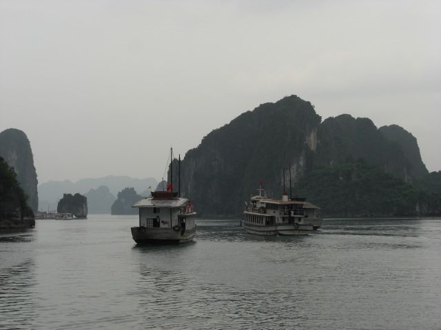 参加者が急に増えたため、大きいバスに変更し、30分遅れてハノイを出発。早いこと早いこと、あまり整備されていない道路をつぎからつぎへとクラクションを鳴らしながら追い越しを行い、ハロン湾には、予定通り通り。ひやひやの連続で、ちょっと疲れて船に乗船。でも、ハロン湾はゆったりと美しく迎えてくれました。船上から見るハロン湾の島々は、素敵でした。ハノイの喧騒とは違い、自然の中にのんびりと時が流れていました。船の中での海鮮料理も、まずますで、船内に乗り込んで売りに来たハマグリとシャコを料理してもらって、満足。1日のツアーとしては、忙しいツアーだったが、楽しむことができました。