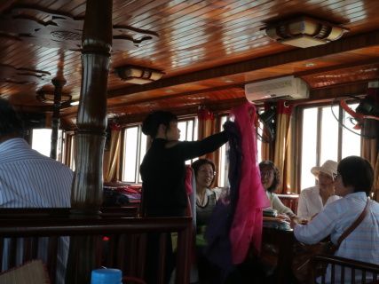 テト前だとわからずに、予定を見たところ2月4日しかインドシナ号が予約が空いておらずあわてて取りました。当日時間通りホテル前に日本語ガイドさんがやってきました。ホテル前は車規制されていた為、大通りに出てタクシーに乗りました(もちろん無料です)。インドシナ号はクラシックな木造船でゆっくり見たかったのですが、すぐに出発。ディナーはベトナム料理の数々特によかったのは出来立てを一生懸命運ぶウェイターウェイトレスに感動します。食事の合間には、民族音楽と2人の扇を使った舞踊が1階と2階を行ったり来たり。たいへんだー!!