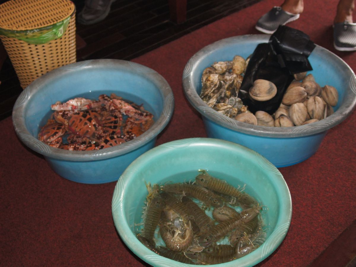 途中で外からボートが近づき、フルーツ売りの人、海鮮売りの人が乗り込んで売ってきます。フルーツ売りの人からはマンゴーを買いました!船のサービス係の人に渡したら、ちゃんと剥いてくれます。海鮮はハマグリとかカニが売っていて、買った人は調理してもらってました。その場で食べられます。