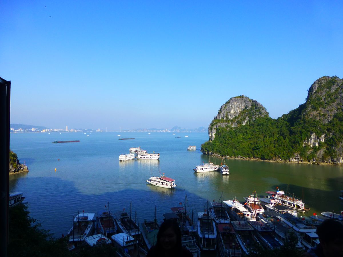 予定通り朝8:00にホテルでピックアップしてもらい出発。途中でお土産屋にてトイレ休憩30分。13:00ハロン湾の港に到着。すぐに出港して食事。想像していたよりちゃんとした食事でおいしかった。6人くらいずつにテーブルに分かれて大皿料理を取り分けて食べました。食事している間に船は島々の間に入っていきます。ガイドの方が、海から突き出た岩の形が犬だとかなんだとか説明してくれます。景色はきれいでした。いったん船を降りて鍾乳洞見学。かなり大きな洞窟で静かに見学できたらもっと感動したと思いますが、ライトアップがカラフルで、ガイドさん方の各国語での大声が騒がしいので「ありがちな観光地」状態でした。16:00頃に港にもどり20:00頃にホテル到着。帰路でもお土産屋で30分のトイレ休憩あり。移動時間が長いです。