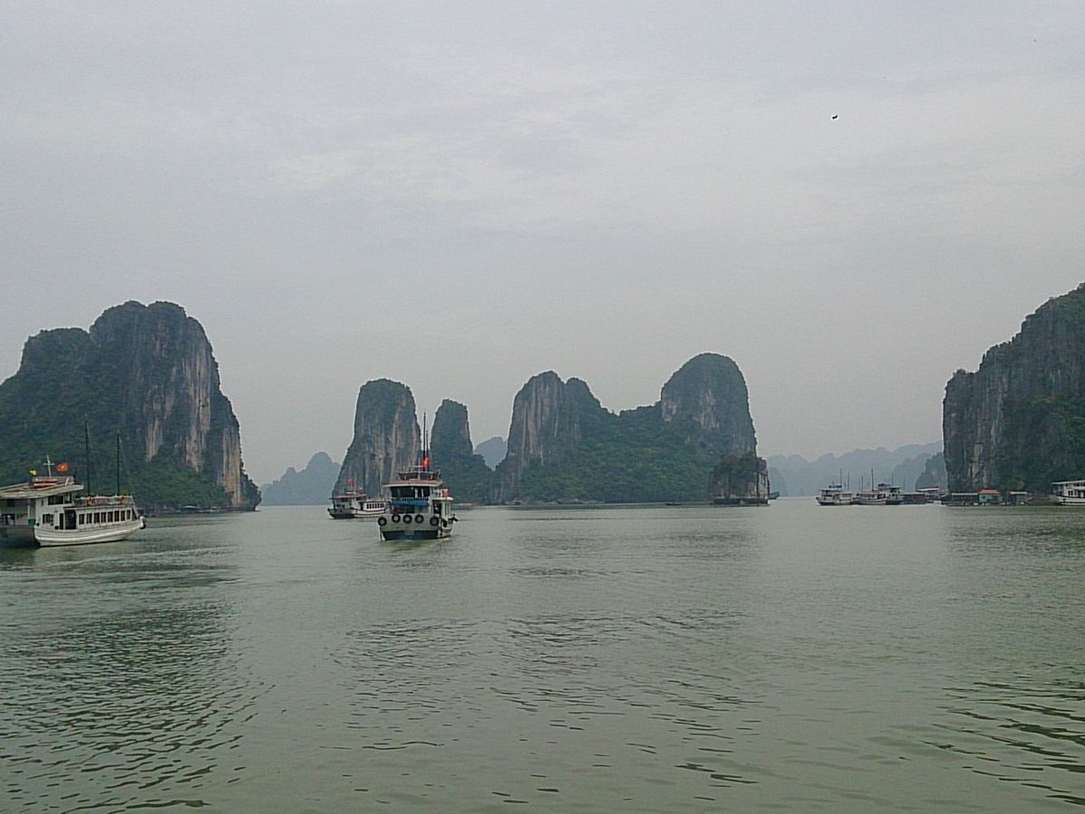 ハノイ宿泊2日目!ツアー当日早朝から雨で・・少々不安でした。今回、友人と3名でハロン湾ツアーに参加致しました。ベトナムに来る3日前の事、日本のBSテレビで俳優の大和田兄弟がハロン湾の絶景や水上生活者を紹介した映像が流れており、期待が膨らみ!ワクワクしながら参加しました。ハノイ・ホテルまで迎えに来たツアーバスに乗り込み総勢10名のツアーが始まりました。ハロン湾に向かうバスの中で現地ツアーガイドさんの話も楽しく、ハロン湾では「カブトガニ」が採れ食べる事が出来ると聞き、是非食べてみたいと思いました。ベトナム料理は私には合っているのか・・食べる物全てが美味しいと感じました。さてハロン湾に着き曇り空でしたが、雨にも合わず10名貸し切りのクルーズが始まりました。海の色が緑色であまり綺麗ではありませんが、海の中にそびえ立つ断崖絶壁の奇岩が点在する、光景は感動しました。水上生活者の村もテレビで見たのと同じ場所で感激!昼食の時間に、現地の漁師さんが船で取れたての魚介類を売りに来て、大きなハマグリ?と大きなシャコ、ワタリガニ購入しクルーズ船のコックさんが調理してくれます。味付けも絶品で美味しく頂きました。残念ながら・・カブトガニが当日採れなかったとの事で、カブトガニは次回に挑戦する事にしました。同じテーブルに並んだ方が、日本の隣の県の方で知り合いになれましたし!同じ趣味で、近々一緒にバイクでツーリング予定です。異国でたまたま隣り合わせて、知り合いになったり!現地の方と知り合いになったり!最高の旅でした。やはり・・・食べ物が旨い国が最高に楽しめると感じました!