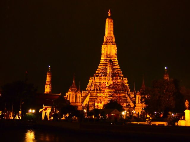 ライトアップされたワットアルンを前に写真を撮って