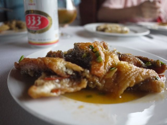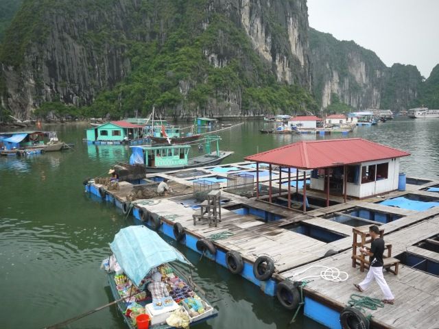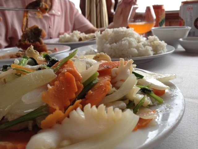 水上生簀のような場所に立ち寄り好みの魚、カニ、エビ等を買うと船内で調理してくれます。価格は高めだったそうです。