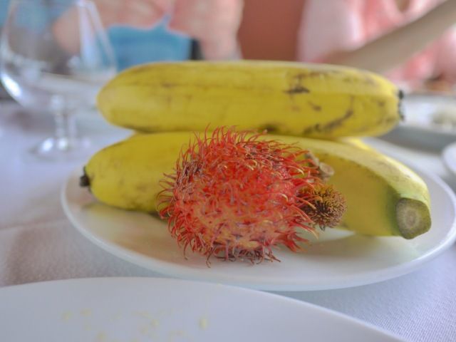 また、小舟で寄ってきた船からは小さな女の子がバナナとライチのような果物を持って窓を開けてきました。そして、私たちのテーブルに置いて「2ドル」とお金を要求。テーブルに置かれちゃったので渡すしかなく、おいしく果物を頂きました。