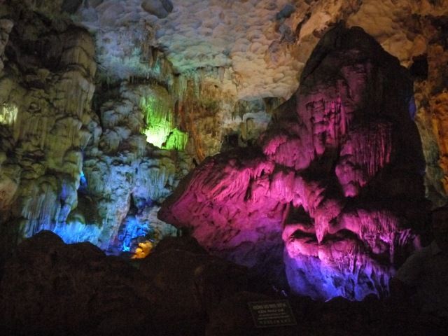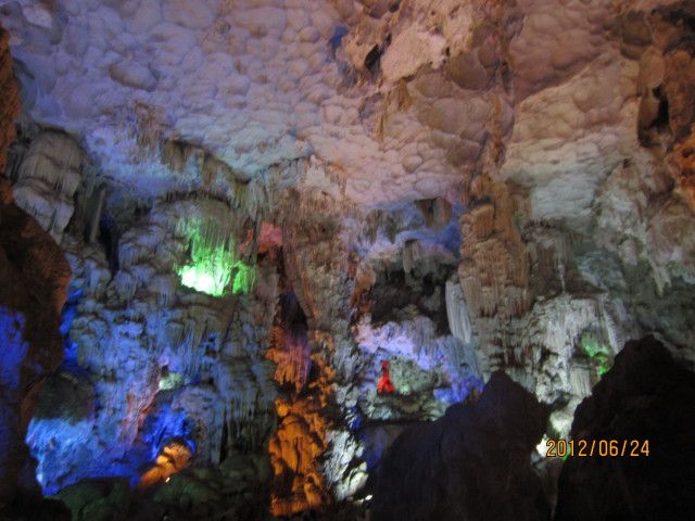 鍾乳洞は蒸し暑く、赤や青、黄色等のライトアップがされていました。中国の支援と聞いて納得の彩りです。帰りの階段が急でヒールで行くと大変かもしれません。