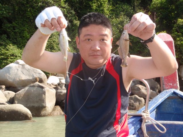(チキン、小イカ、ワタリガニ、海老、sausage、トラギス、長茄子、モンキーバナナ、スイカ)充実している。旨い。(ビールは当然有料、ペナン島はビールしか売ってないので、大酒飲みは日本から持参する事を勧める。乗り継ぎ便の場合は、乗り継ぐ際に没収されるので、日本でチェックイン前にスーツケースに入れる必要有り。つまり免税品は持ち込めない。)monkey beachにトイレは有るが、紙は無いので、紙も持参が必要。食事後は猿と遊べる。釣り船での移動をcruisingと考え、旨いBBQ、初心者の面倒も見てくれる手釣りも付いて¥5,000弱/人(Jan.2011)はお買い得だと思う。釣れる魚は大きくても手のひらサイズのイシモチ、トラギス、シロギスの別種、フグ、ゴンズイ、ギマです。でも初心者は十分楽しめると思います。潮目にもよるでしょうが、我々は1人につき10分に1回は掛りました。15分以上食い渋ると、船を移動してポイントを変えてくれるので、船頭も親切です。釣上級者にとっては金魚釣程度とお考え下さい。でも、初心者や特に家族向けとしては、お得で、とてもお勧めできるtourだと思います。
