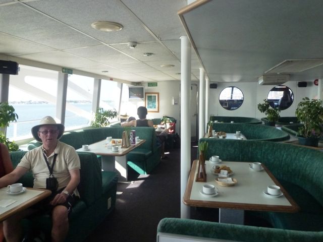 早く乗船すると上階のソファ席(写真)に案内されますが。下階の硬いイスの方が揺れがマシだと思います。
