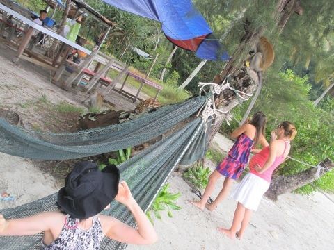 しばらく釣りしたら、モンキービーチに上陸。ペナン島の海は透明度はありませんが、贅沢を言わなければ泳げます。泳がなくても、ハンモックでお昼寝ができます。椰子の木から下がったブランコもあります。ターザンにもなれます。