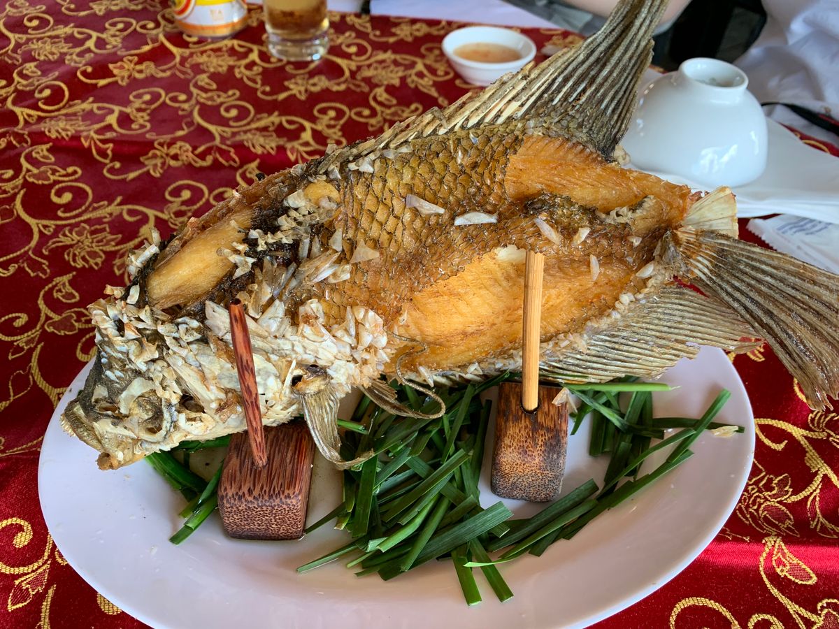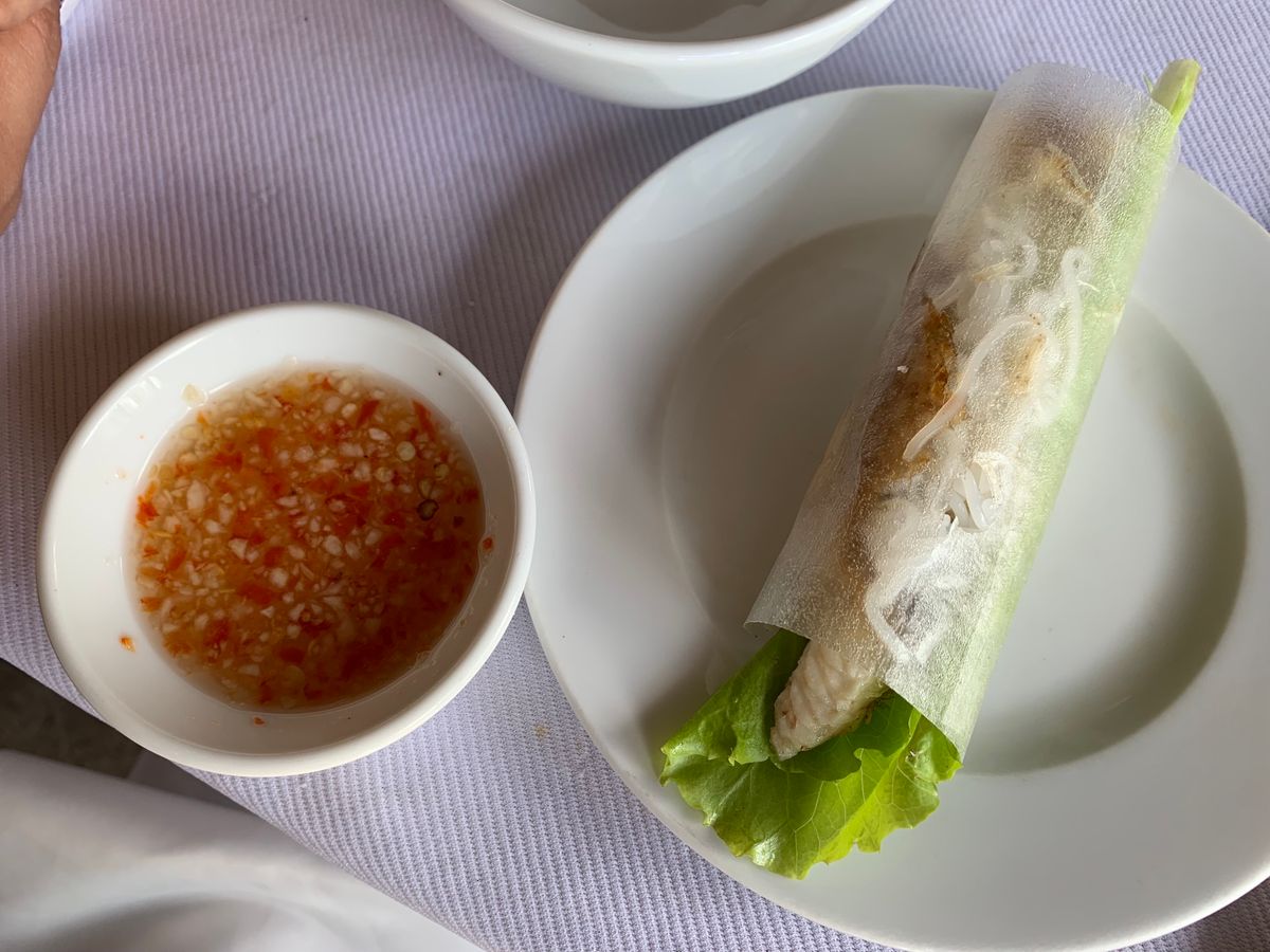 各グループ毎に一匹だと思っていましたが、実際には他グループと合わせて四人で一匹のシェアでした。味は美味しかったのですが、実際に食べられた部分は少なかったです。最初は店員さんが一人一人に春巻にして渡してくれていたのですが、手が回らず途中でどこかへ消えてしまい、後は自分達で自主的に作ることになりましたが、そのことの説明はガイドさんからも無く戸惑いました。