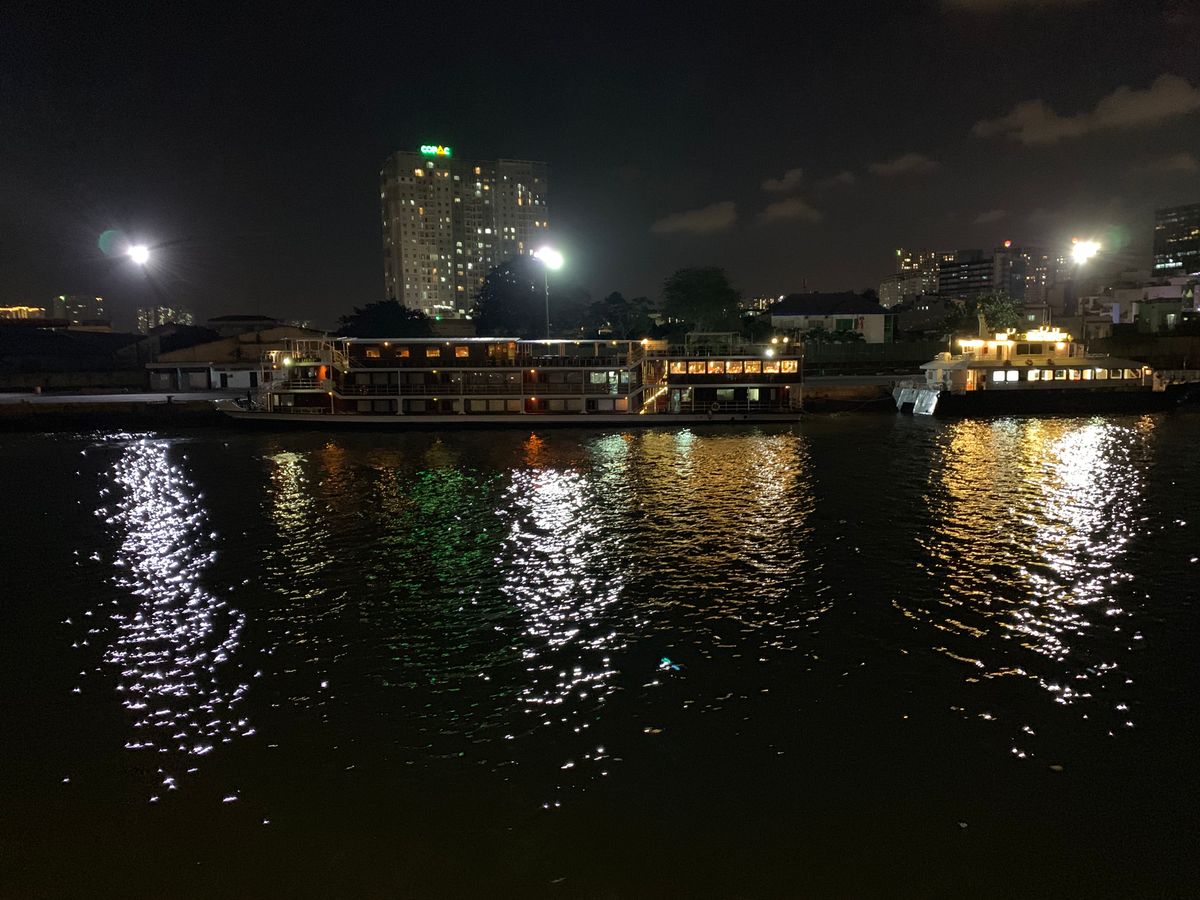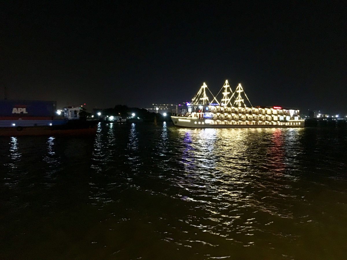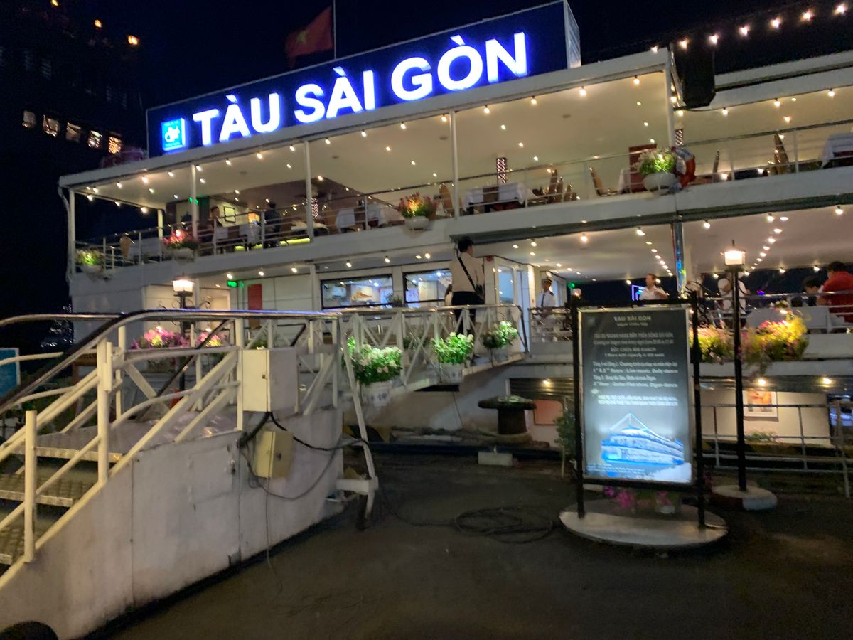 豪華な客船で美味しいディナーでした。船にはお花も飾ってあり、優雅なディナーでした。最上階の席でしたが、少しステージからは遠かったです。何故か下の階の大音量でのカラオケ的なステージも同時進行らしく、全く別の音が重なって少々うるさかったです。ただ、これはこれでゆっくりできました。少し早めにお料理も出たのと船自体がゆっくり進んだので、特に船酔いなども気にならなかったです。スタッフの方のサービスも良かったです。ドリンクは別料金です。食事終了後にウェイターに支払います。ドンの支払いは桁数が多く神経を使うので、お釣りのいらない金額でオーダーすると、支払いが楽だと思います。
