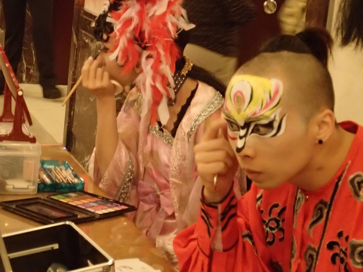 少し早めに着いた待ち時間に、劇場スタッフがお茶と共に獅子の操り人形で持て成してくれたり、化粧をされてるのを見させくれたり、最後は演者と記念写真も撮らせてもらいます。