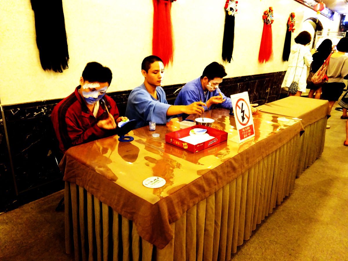 終演後、劇場外でオカマちゃんと写真と撮ることができますが、チップを要求されます。ガイドさんからのアドバイスで「一人40~50バーツが相場だから、それ以上要求されたらちゃんと断わりなさい」とあったのですが、実際ぼられそうになりました。。。「ハポン、ハポン」とオカマちゃんがしきりに言っていたのですが、どうやら日本人からは巻きあげやすいみたいですね(ーー゛)