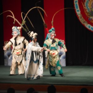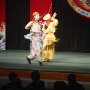 今回は土曜日なので、人形劇と孫悟空の京劇の2部作をみることができました。人形劇は操り人形で、中国の正月を祝う出来事が巧み、面白く表現されていました。京劇は、三蔵法師を妖怪が狙う、孫悟空らがアクロバット的に守る迫力あるステージでした。