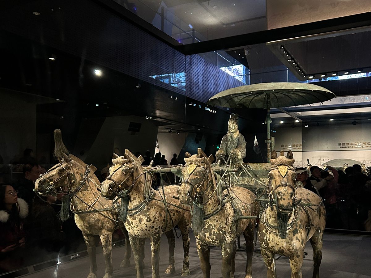 秦の始皇帝陵では銅馬車を360℃からしっかり見ることができ、この他の副葬品もしっかり見学できました。敷地が広くカート車移動のため、昼食や夕方のフライトを考えて短縮ルートで案内してもらいました。何度かカート移動があるのですが、ここでも李さんがすり抜けていくので時間短縮できました。