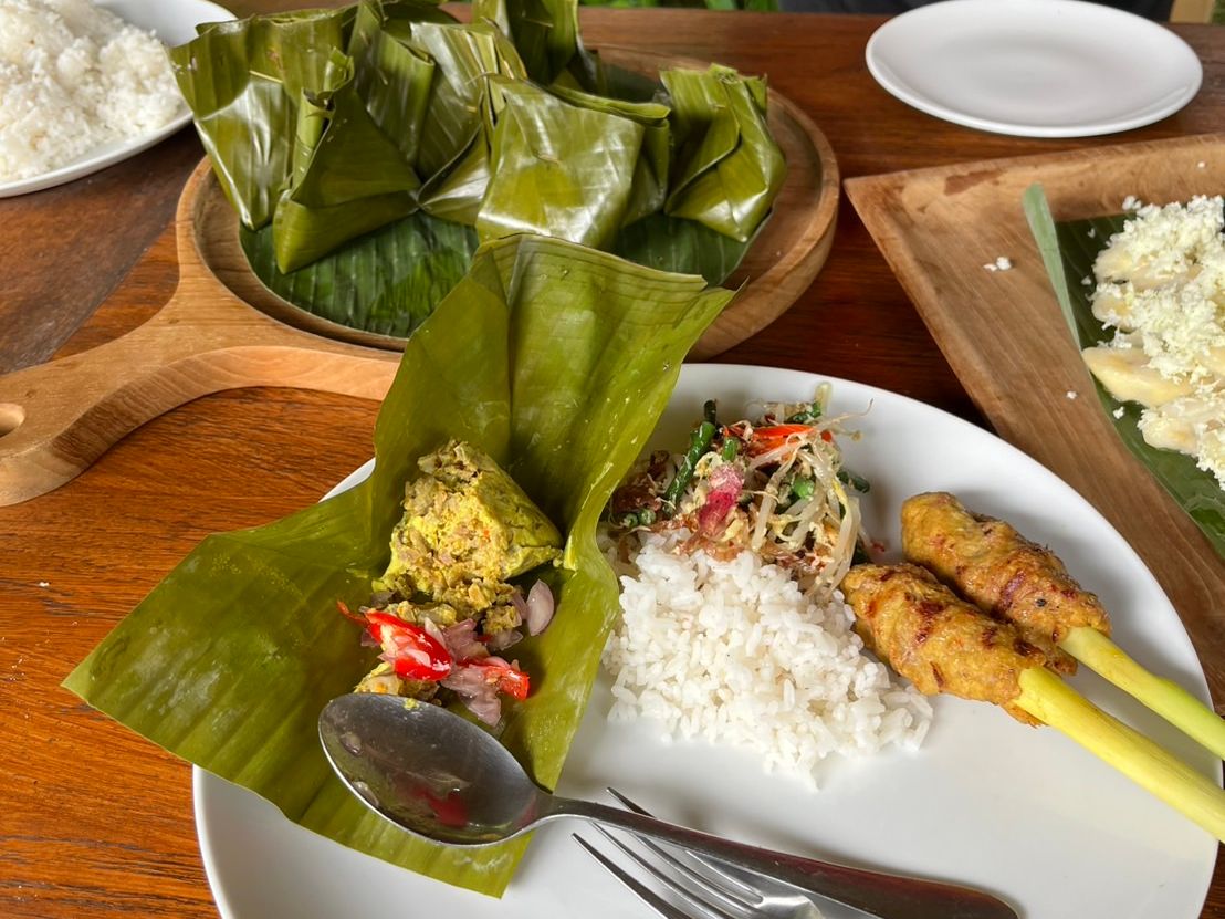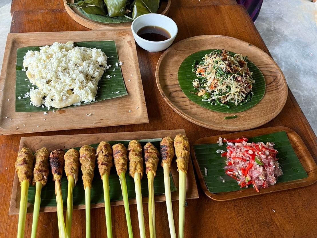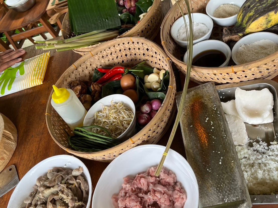 この料理教室を通して、バナナの葉で食材を包んだり、レモングラスを串に使ったりという