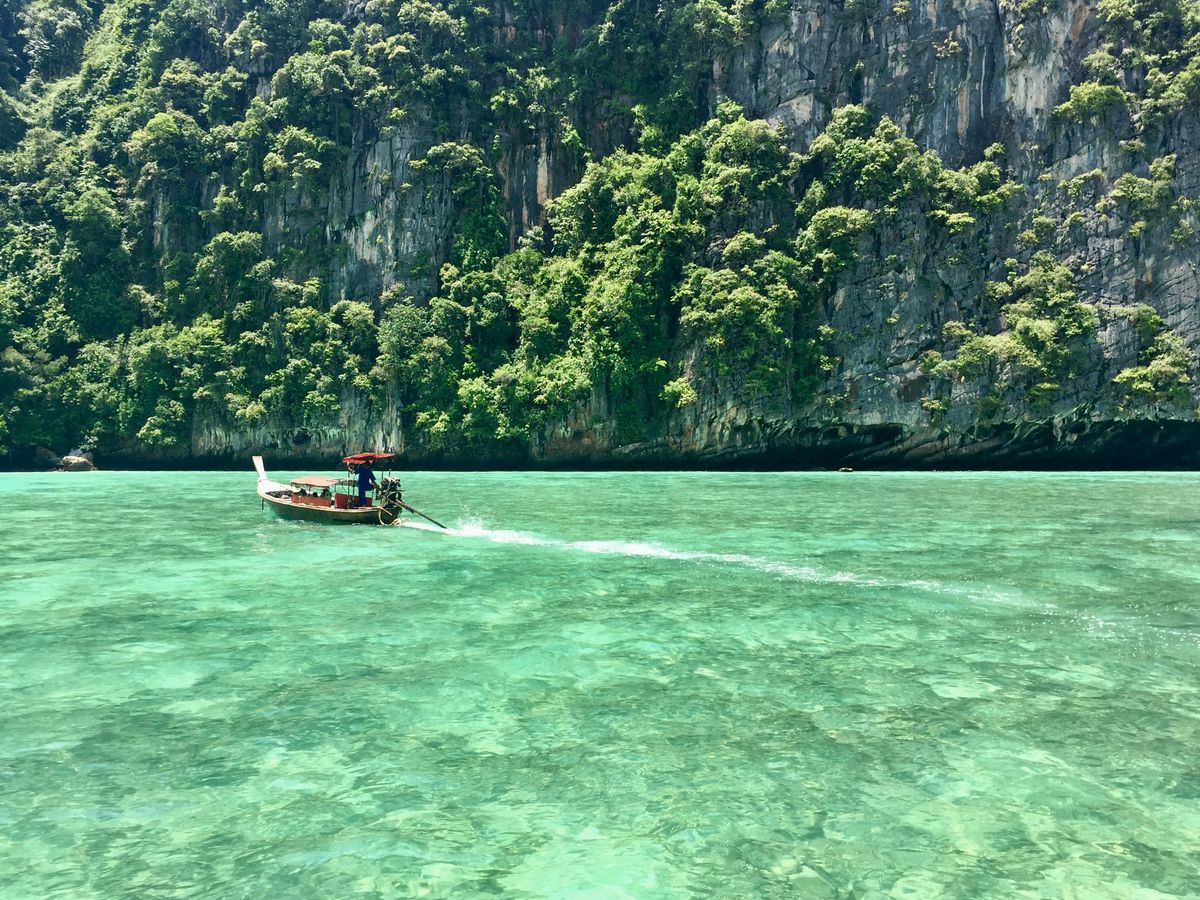 快晴の中、本当に美しい景色と海を堪能していただけたようですね。2枚目のお写真はエメラルドグリーンの透明な海に浮かぶロングテールボートがなんとも素敵です。ご心配されていた船酔いもなく、失くされた携帯も奇跡的に見つかって、本当に良かったです。あの広い海で失くし物が見つかるなんて、きっとyun様の日頃の行いも良いのだと思いますよ!
