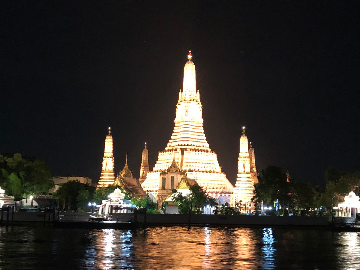 女子旅最終日のディナーで参加しました。料理はタイ料理、日本料理、デザートなど様々でした。特にフルーツが甘くてデザートのプチケーキが美味しかったです。川の風が涼しく、景色も良くステキなディナーでした!特にワットアルン(暁の寺)のライトアップをクルーズで見ることができたのが一番良かったです。船内では音楽が流れていてタイの曲やインドの曲、日本の曲などもあり、料理や夜景だけでなく音楽も楽しむことができました。価格も安くおすすめです!