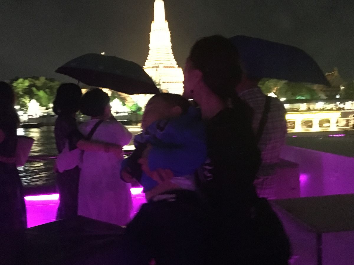 三歳の息子と参加しました。雨が降っていたので室内に移動は仕方がないことだが、タイの民族のショーも遠く離れたところで、こちらに来て一緒に写真を撮るなどのサービスも無かったので、ただのクルーズバイキングだった。寺が近づいたら外に出て写真を撮るサービスがあったようだが、特にお知らせもなく…撮れなかった。船を降りる橋の手前で、その写真が販売されていました。