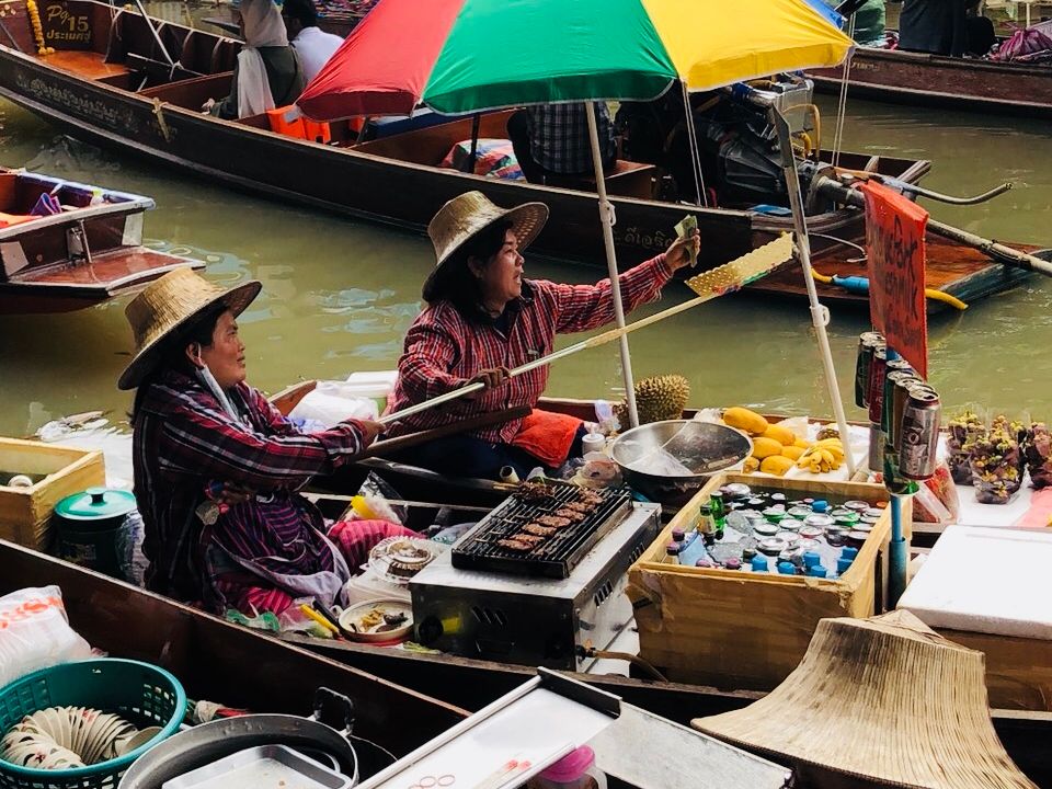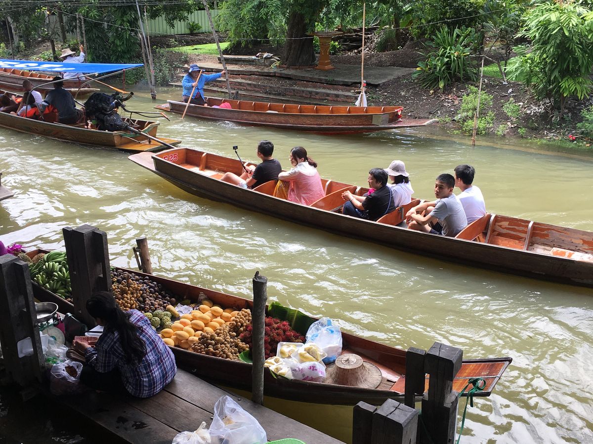 水上マーケットでは是非、モーターの船に乗ってもらうと、すれ違うスリルや、実際の水上生活している家も見え、日本では絶対に味わえない体験ができます。ガイドさんがはじめに乗るかどうか点呼をとってくれ、1人200バーツで乗り場まで連れて行ってくれました。