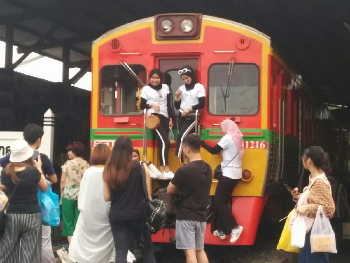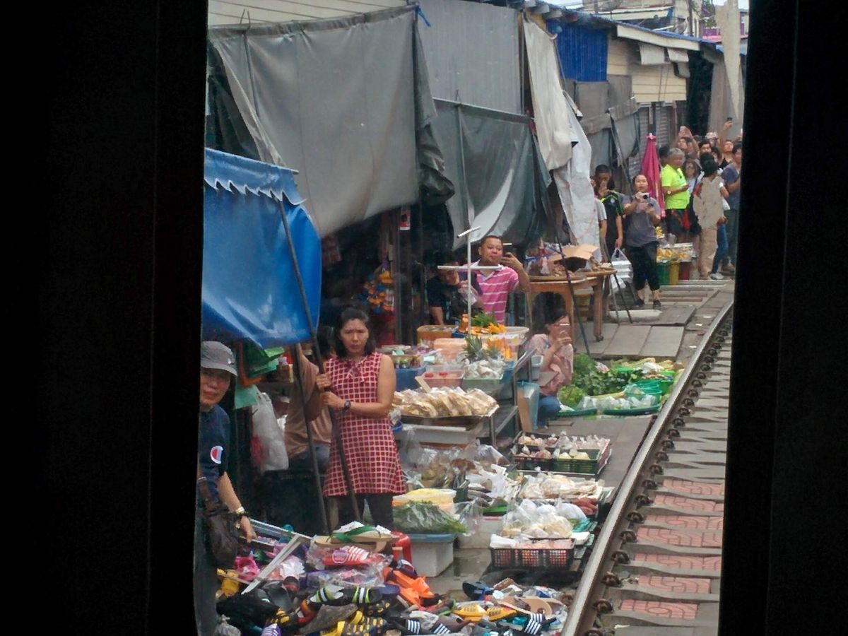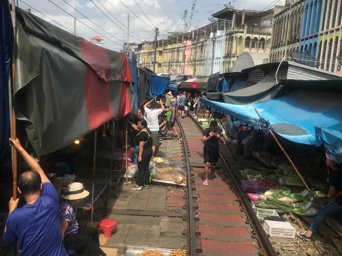 水上マーケットやオプションの象乗り体験の後、鄙びた田舎の駅に到着。ローカルの人に交じってそこから列車に乗車し10分ほど。列車の警笛がすごいなーと思っていると線路に人がひしめき合ってカメラを構えています。そこがメークロン市場でした。ガイドさんに従って1番前の車両でしたが、残念ながら市場をぱたぱた畳む様子を見ることはできませんでした。列車を降りる頃には、すっかりお店は元に戻っていました。一番後ろに乗っていたら、お店を広げる様子が見られたのではないかと残念でした。