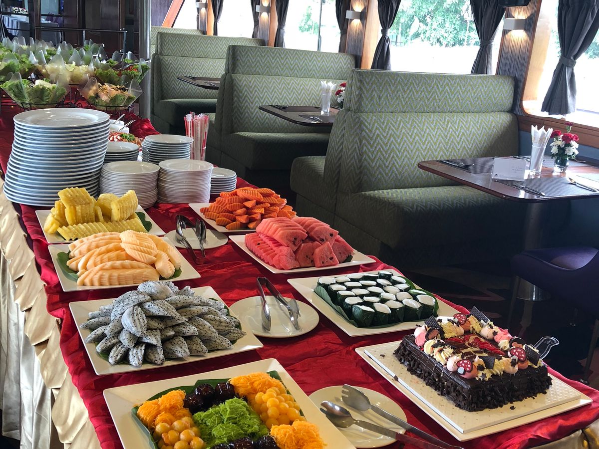 途中でフルーツ(バナナ、スイカ)をもらえ、昼のビュッフェではチキンや炒め物など美味しいタイ料理が食べられました。