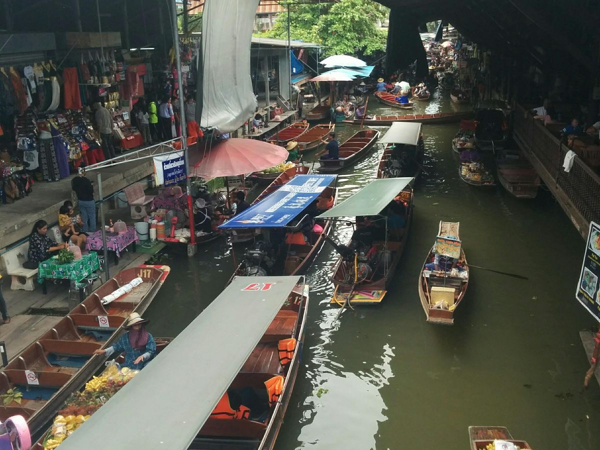朝、時間通りにピックアップしてもらい、土曜日だったせいか、渋滞もなく、ココナッツファームに到着し、ココナッツのお砂糖を試食しました。ここのお土産高かったです。次に水上マーケットに行きました。200バーツで水上マーケットの船に乗りました。狭い水路にたくさんの船が渋滞しぶつかり合い、隣の船の日本人の方がバナナや焼きバナナを船越しに下さり、焼きバナナは安納芋の焼き芋みたいでとてもおいしかったです。