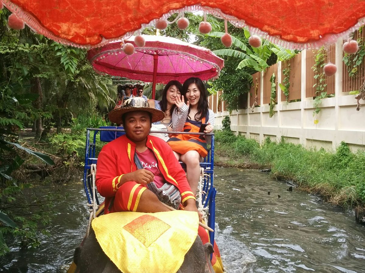 8時に集合ということでちょっとだけ早起きして始まった一日中でした。移動距離が多いので、自分たちで交通手段を調べるよりも、ずっと車で移動できるのはとても楽でした。ガイドさんも車の中でもタイのことについて話していただいたり、観光地に行くたびにその場所の説明をしていただき、いろんな情報を知ることができました。今回参加したツアーでとても楽しみにしていたのは水上マーケットです。水上マーケットは午前しかやっていないため、それに合わせたスケジュールが組まれていて、効率よくタイを観光することができました。水上マーケットでは楽しくて買い物もでき、時には値切ってみたりしてみました。そして、念願のゾウにも乗ることができました。ガイドさんがとても優しいので、ケータイで写真を撮っていただいたり、自由時間に一緒にお話したりするなど、楽しい時間を過ごすことができました。さらに、線路市場メークロンでは、市場の様子を上手に動画に収めることもできました。プラン設定もよく、何よりガイドさんが日本語を流暢に話すことができるので、コミュニケーションに困ることがないというのがとても良かったです。