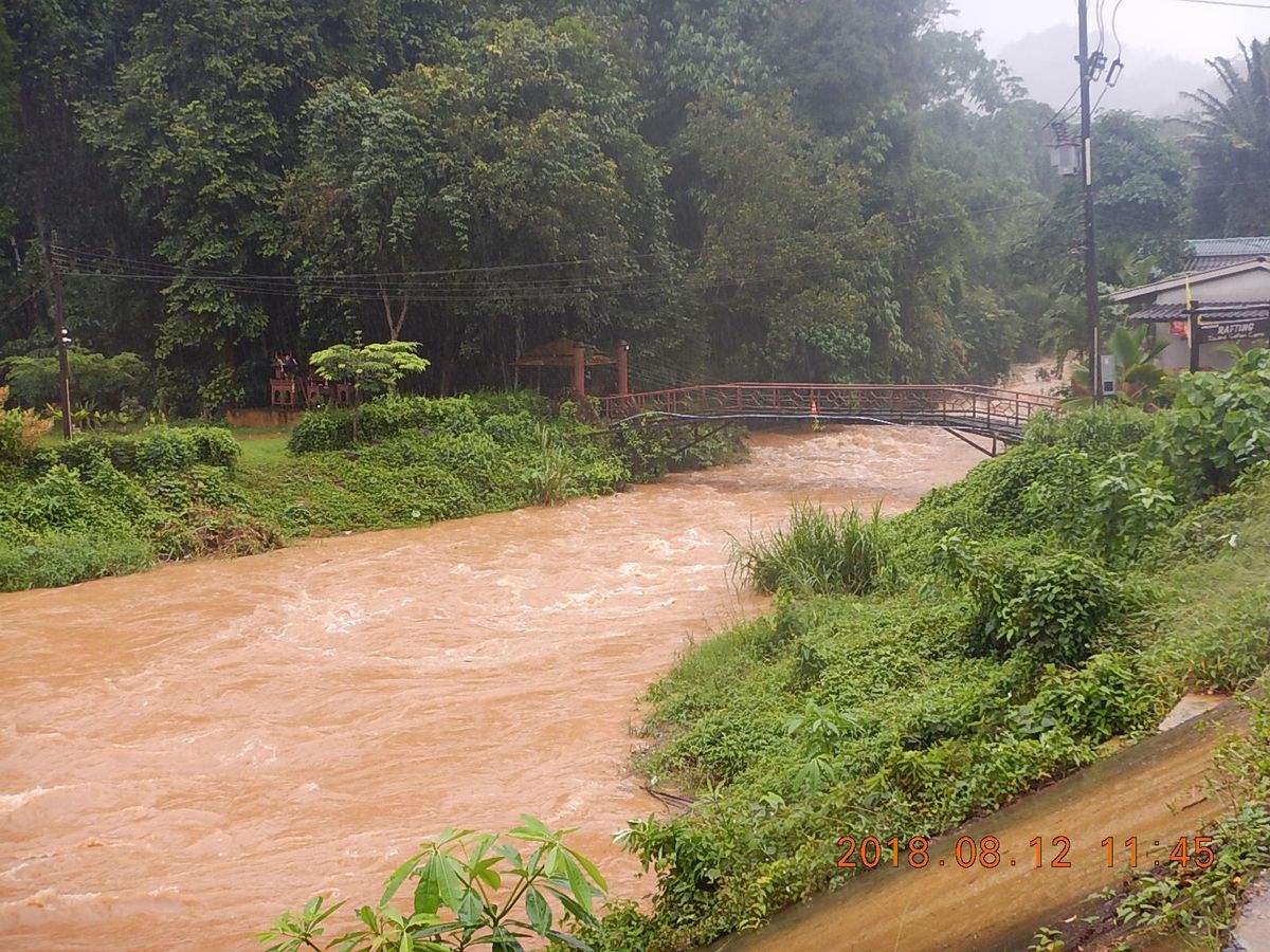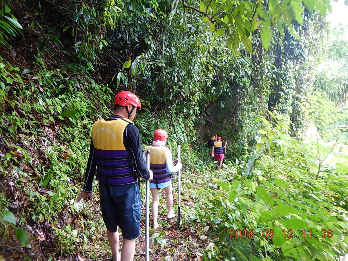 ジャケット等の身支度を整えトラックに乗ってラフティングのスタート地点に移動。インストラクターの説明のあと、5人と4人の2チームに分かれ、ボートに乗船する為に険しい川沿いの道を歩くこと3分。(カカトがあるマリンシューズは必須アイテムですので忘れずに)雨季ですから仕方ないのでしょうが乗船場に到着するも川は激流となっており、とても川下りをする状況ではありませんでした。スタッフの判断で中止となりました。一度Rafting4Uに戻り昼食のあと、今度は滝壺遊びに出発。ガイドさんの明るく丁寧な説明があり、雨の中を滝に向かったのですが、ここも増水していて中止になりました。再びRafting4Uに戻り、ガイドさんより、他のアクティビティーに変更するか返金を受けるかの説明があり、参加者