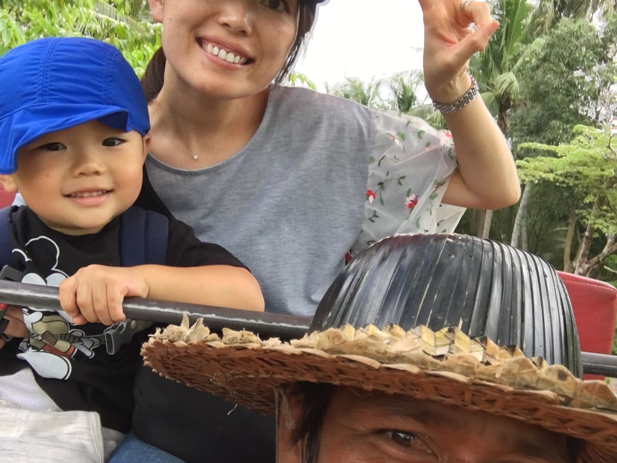 水上マーケットは当初、口コミで観光客相手のネガティブなコメントが多かったのですが、ボートで飲食ができるとの事でしたので、せっかくなので、雰囲気を味わいたく、別料金の追加の手漕ぎボートを乗ったところ、これがまた大正解!物価は事前にガイドさんも値段高いと言ってましたが、確かにボートから注文した缶ビールが100パーツかよ!と思いましたが、船を寄せてもらって頼んだので、断れず…まぁ想い出はプライスレスです。妻と子どもはマンゴーの小さな傘が刺さっている可愛らしいかき氷。手漕ぎボートからいい写真が撮れました。
