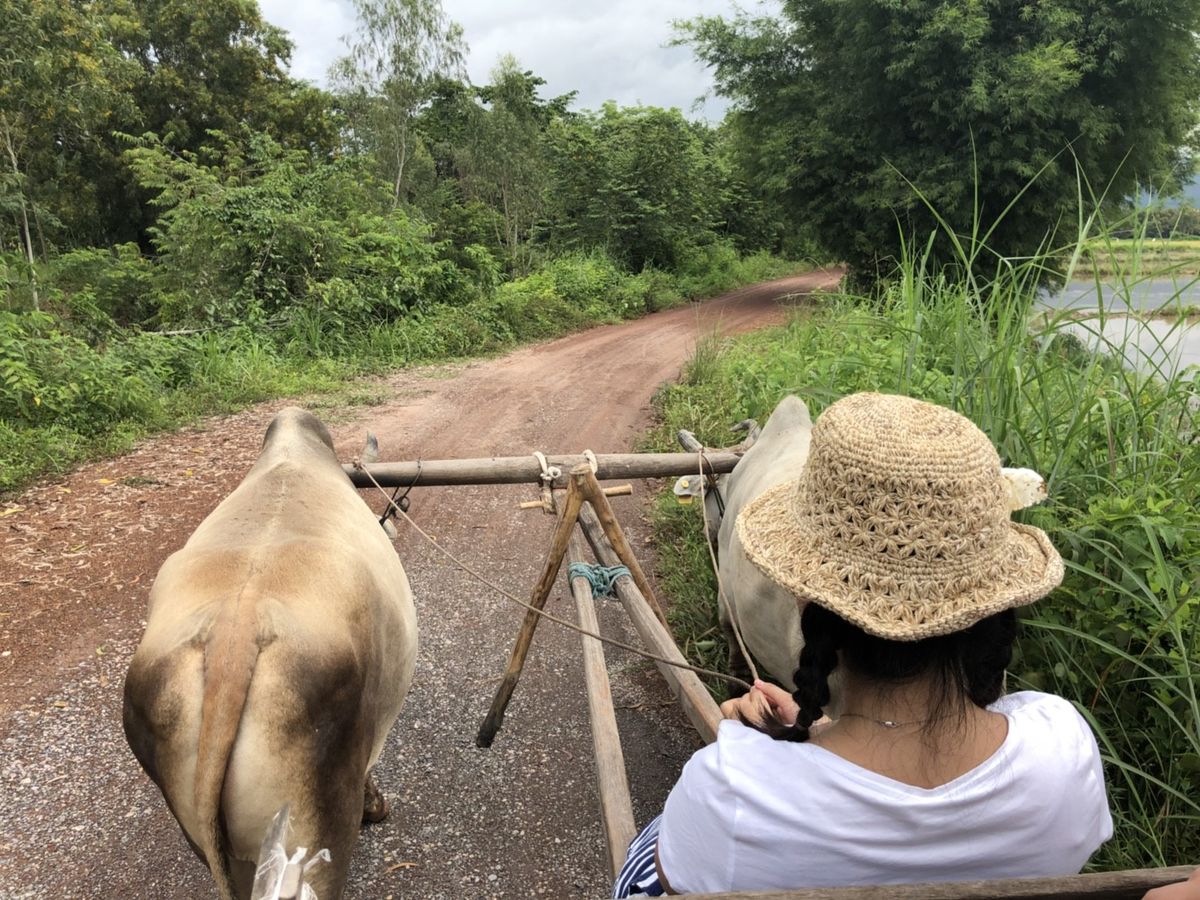 朝7時から車で、ローカル市場に行き、地元の人たちの普段の生活に触れました。また牛に乗せてもらうのは、自然豊かな田んぼをゆっくりと体験できます。
