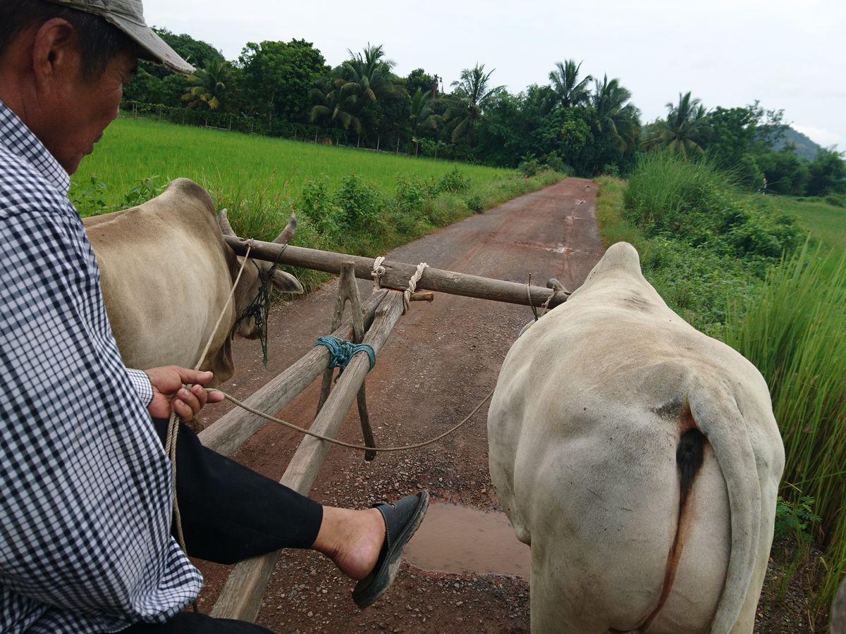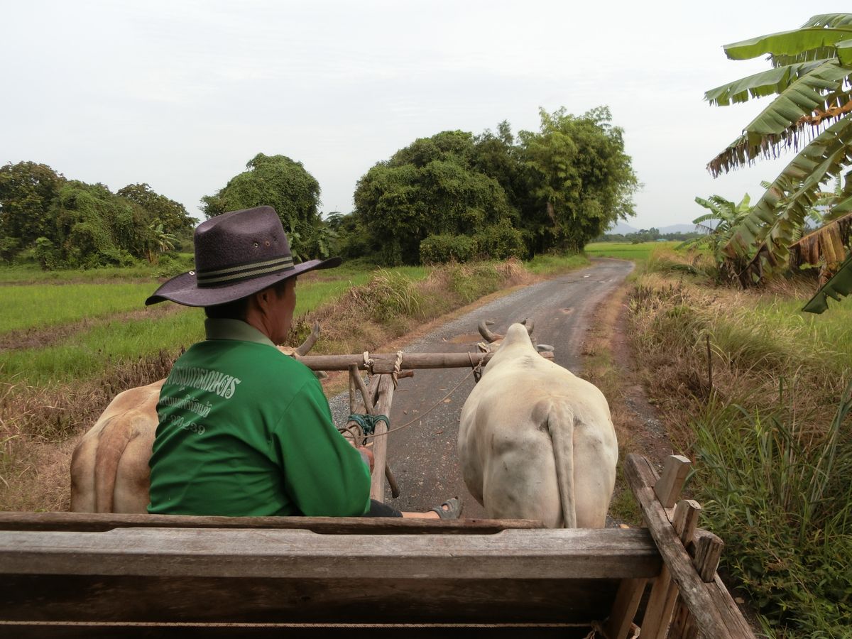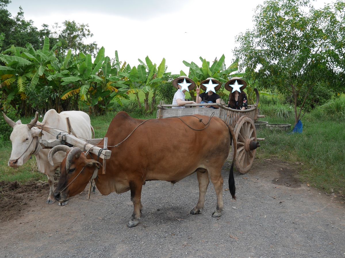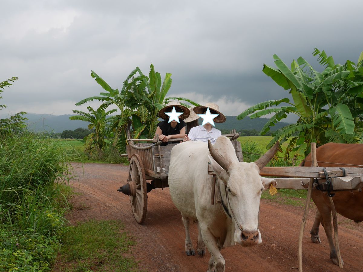 ★7/25にツアー参加。参加メンバーは私たち夫婦の他に、欧米人カップルと欧米人の学生さん単独参加で、計5人でした。★ガイドは英語で、英語ができない私にとってはガイドさんが話している内容がよくわからなかったので少し残念でした。しかし、ガイドさんはジェスチャーや簡単な英語を使って説明などをしてくれるので、英語が苦手な人でも楽しめます。★ツアーワゴンは冷房が効いていて寒かったので、羽織る物を持参することをおすすめします。★スケジュールは、口コミで皆さんが書いている通り、市場→牛車→昼食→トレッキング・滝→象の順番です。事前に口コミを見ていたので、とくに問題ありませんでした。★市場見学は、ザ・アジアって感じ。私たちは中国に住んでいたことがあったので見慣れている光景でした。★牛車に乗って、まったり揺られて癒されました。途中、主人は運転席にも乗らせてもらいました。牛はお利口さんなので、主人が運転席にいてもいつもの決まった経路を歩いてくれます。★昼食では、まずパパイヤサラダ作りをしました。すり鉢の様なツボに材料を入れていき、すりつぶしたり混ぜたりする簡単なクッキングです。それから店の人が空芯菜の炒め物を目の前で作ってくれます。よく熱した中華鍋の中に一気に材料を入れる時に火柱が上がる為、シャッターチャンスのカウントダウンをガイドさんがしてくれました。昼食はどれもおいしかったです!その中でもチャーハンと、トウモロコシが入った鶏肉の野菜炒めがとくにおいしかったです。★トレッキングは雨の中、いただいたポンチョを着て行き帰り1時間くらい。ガイドさんから植物などの説明を受けながら歩きます。滝近くには傾斜がすごい、とても急な階段がありました。それを抜けると大迫力の滝に感動・・・水しぶきもすごく、写真では伝わらないくらいの迫力があるので、ぜひ現地に行って肌で感じてみてください。その後、滝を見たら来た道を引き返します。(ポンチョの中はサウナ状態だったので)全身、汗でびちょびちょになりながらも、楽しいトレッキングでした。トレッキングの後には冷たい水と冷たい濡れタオルを運転手さんが用意してくれていて、生き返りました★エレファントトレッキング、こちらも雨の中、ポンチョを着て象に乗りました。象使いさんが傘も貸してくれます。高台になっている乗り場から象に乗って、林や川を含む決まっているルートを一周して戻ってくるといった感じです。途中、象の足場がよくなったあたりから最後まで、象使いさんは象から降りて、専属カメラマンをしてくれます(笑)。象もお利口さんなので、象使いさんが乗っていなくても、いつもの決まった経路を歩いてくれます。そしてお待ちかねイベント・・・私も象の首に乗らせてもらいました!象さんの体温をおしりで感じ、ずしりずしりという振動を体全体で感じ、とても忘れられない思い出になりました。たくさん写真も撮ってくれているので、あとから見返せるし大満足です。象から降りたら、20バーツで餌の入ったバケツを買い、乗せてくれた感謝をこめて象にバナナをあげました。象使いさんへのチップを渡すタイミングが難しく、ガイドさんから支持されるものでもないので、渡しそびれに注意したほうがよいかもしれません。象の餌やりが終わると、象と一緒に象使いさんが奥へ帰って行ってしまうので、その前に渡した方がいいと思います。★ガイドさんも運転手さんもやさしくいい人でした。ツアー事項には書いていませんでしたが、親切にしていただいたので運転手さんにもチップを渡しました。ツアー帰り、ガイドさんの方が自分たちより先にワゴンを降りてしまうことがあるので、チップの渡しそびれに注意した方がいいかもしれません。(バンコク市内が渋滞の場合、送迎のホテルによってはガイドさんと一緒にワゴンを降りて電車を使うようです)★ツアー内容がとても楽しく大満足だったのでお勧めです。
