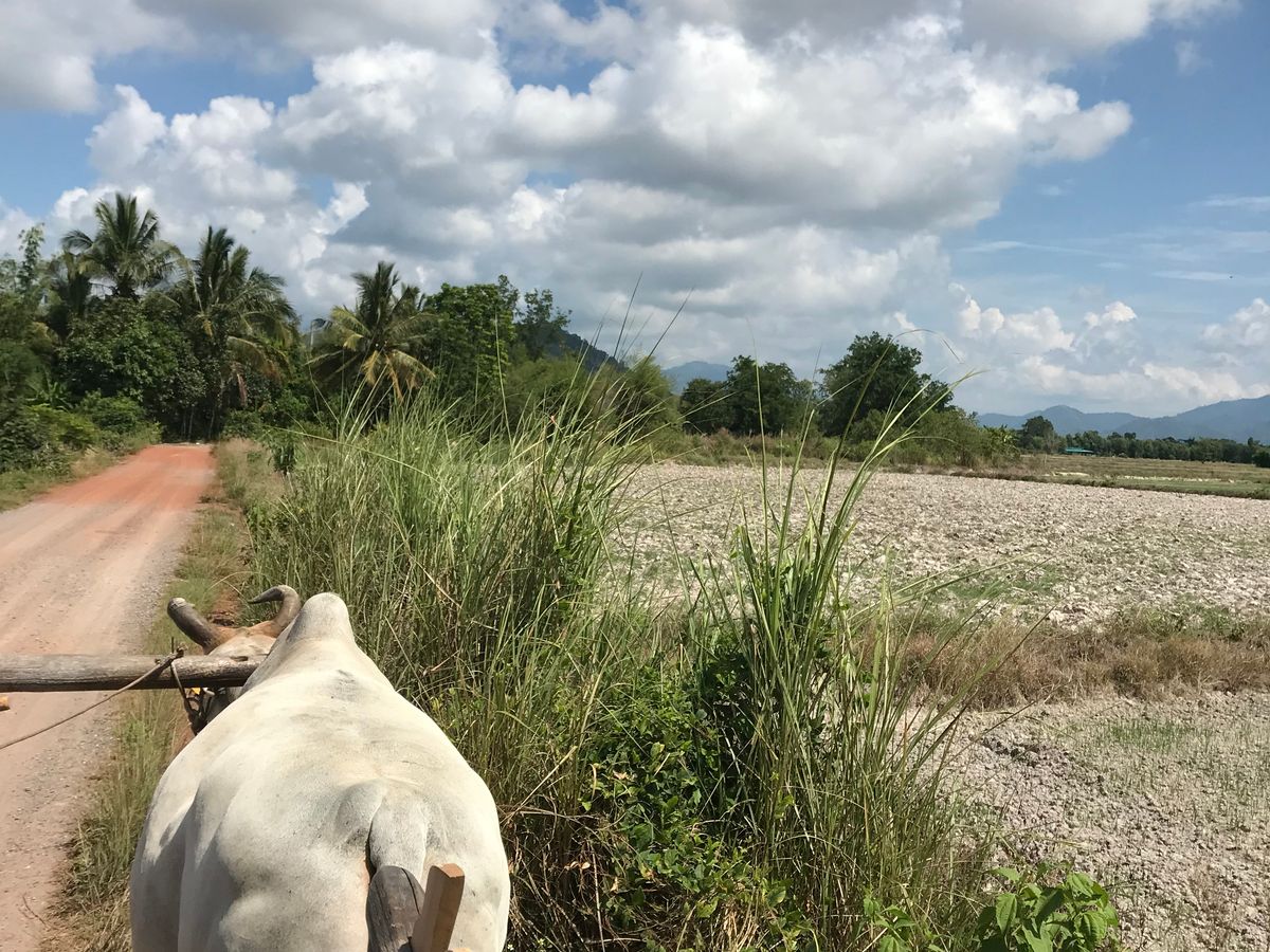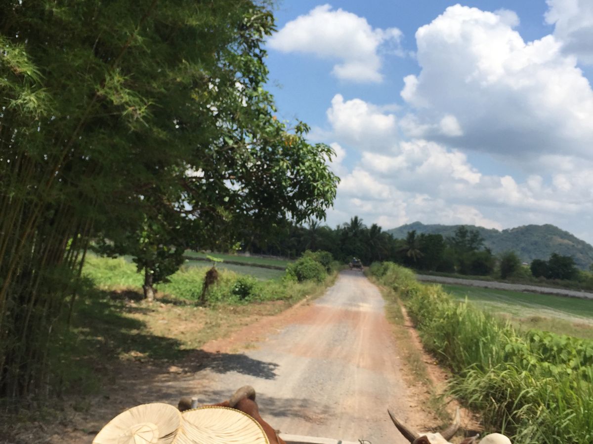 ◎広大なカオヤイ公園に到着し、牛車に乗りライス畑を移動。牛夫さんはタイ語ながら、群生しているフルーツの木や珍しい昆虫などを見つけては教えてくれます。