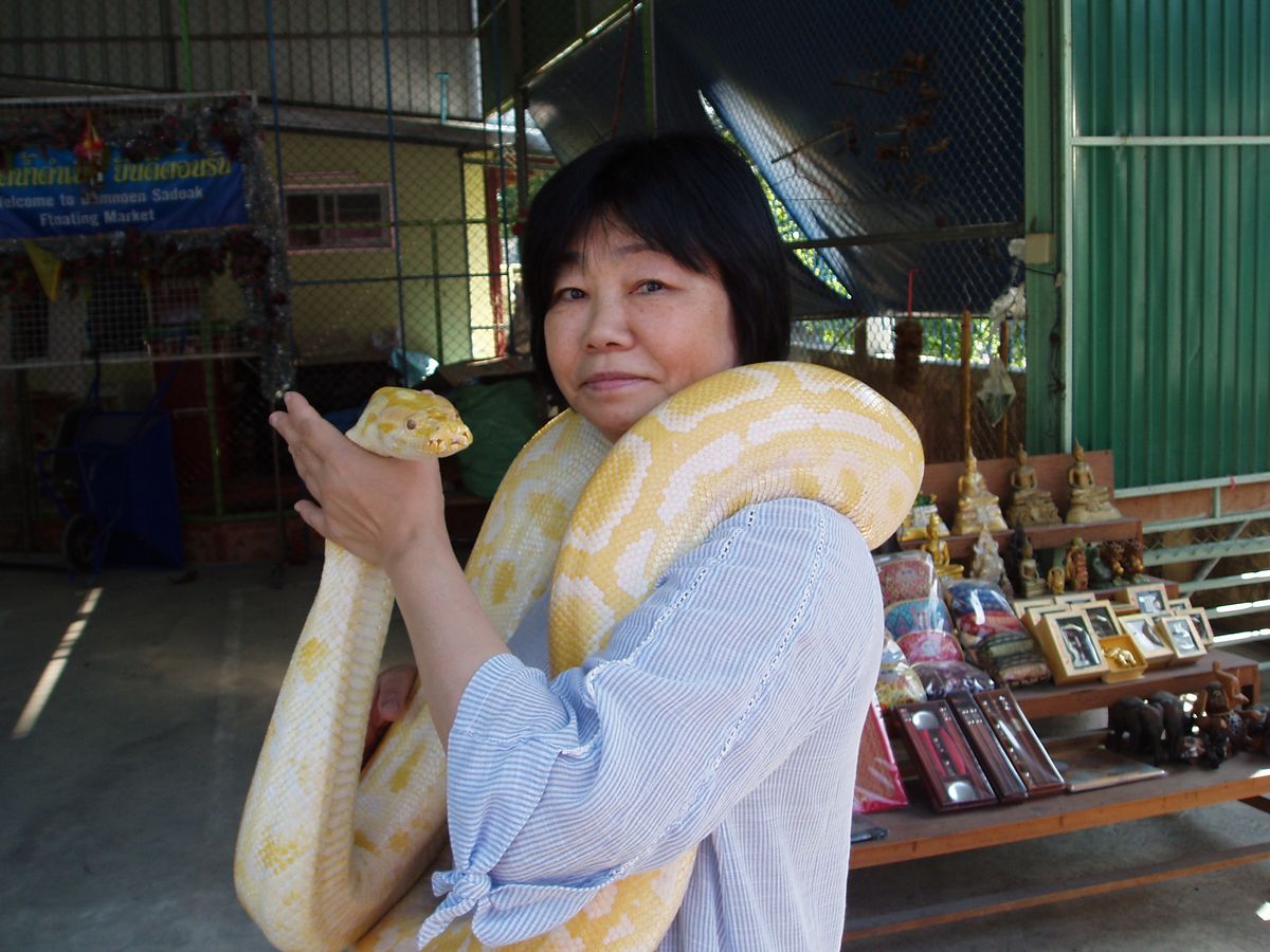 滅多に出会わない白いニシキヘビを首に巻き写真を撮る事をしました。(当然、撮影費用=100バーツ)