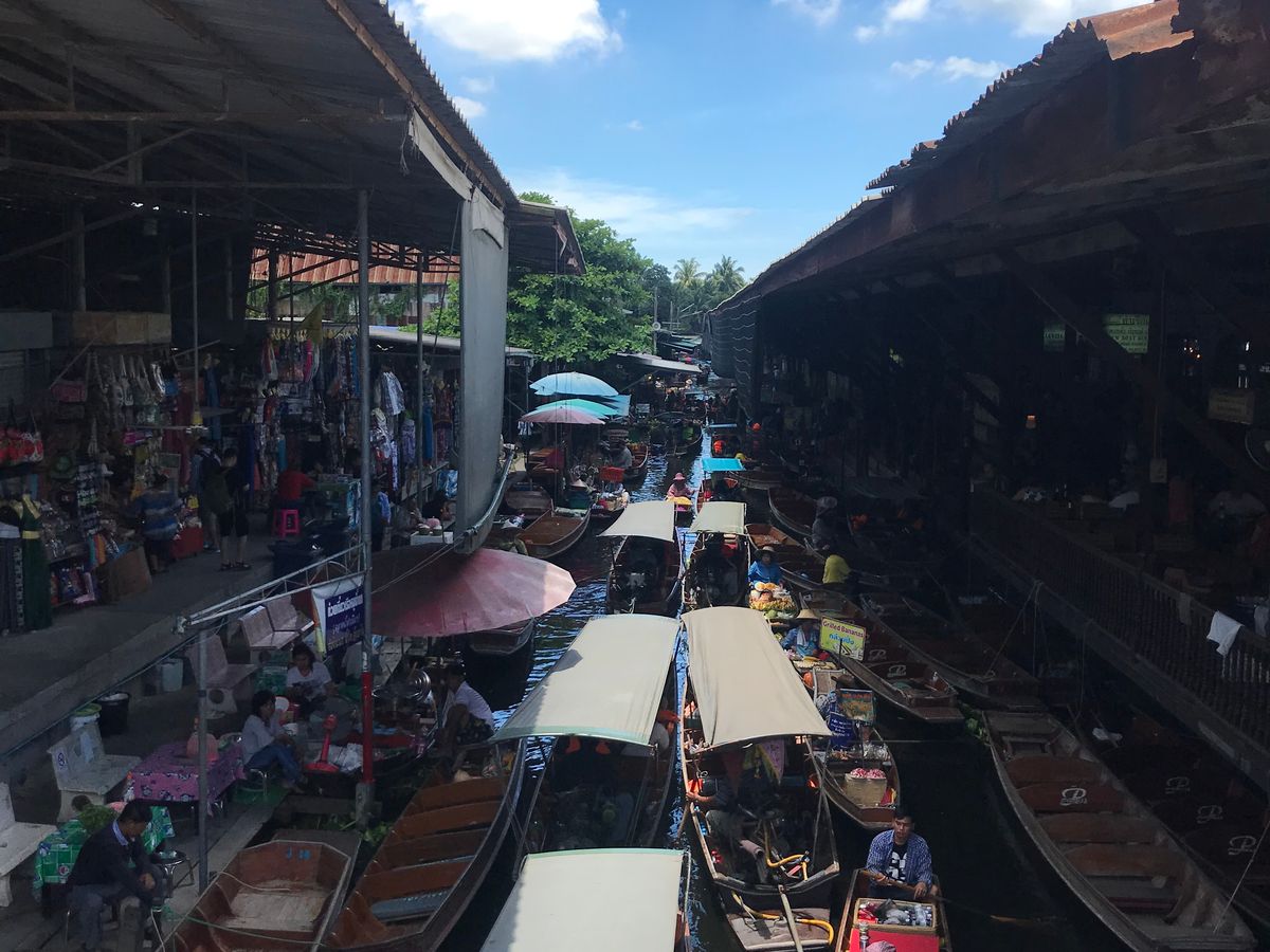水上マーケットに着いてからは手こぎのボートに乗り込み、水路に面したお店をめぐります。観光客が多い市場ではありますが、現地の雰囲気を味わうには最適のプランでした。