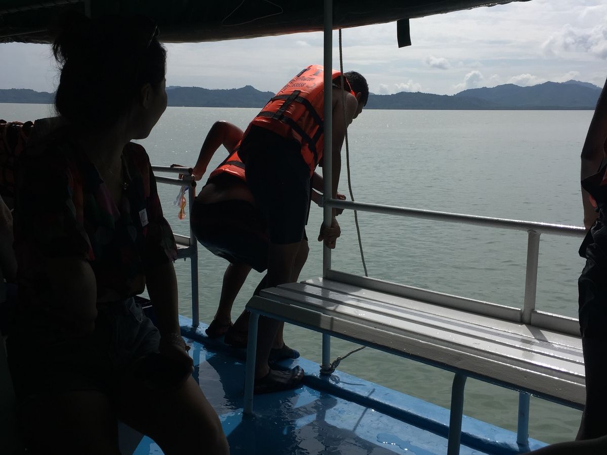 帰路、ほぼ無理やり日本人の親子を抱き上げてボートの屋根に座らせてました。