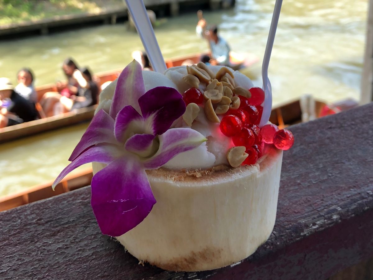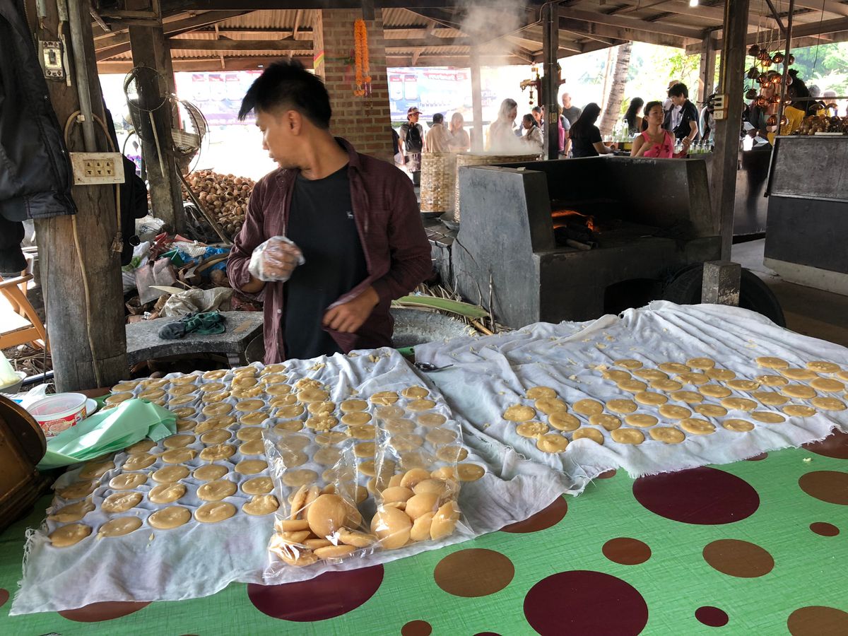 アンパワー名物の竹製のセイロに入ったプラートゥー(さばの種類)や大型柑橘ザボンのむいたもの、大束の旬のライチなど多くの種類の食べ物を売っていて私は、ココナッツシュガー(観光で立寄るところより安い!25バーツ)と