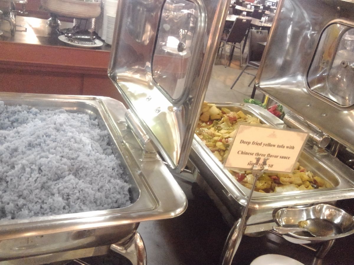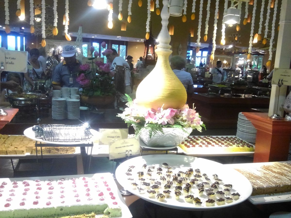 予定時間の書かれている看板を確認し、まずご飯を食べに行きました。美味しいカオマンカイを作ってくれたり、辛いチキンカレーにはまって大汗をかいたり、食べたことの無いタイのスイーツを食べてみたりと楽しみました。