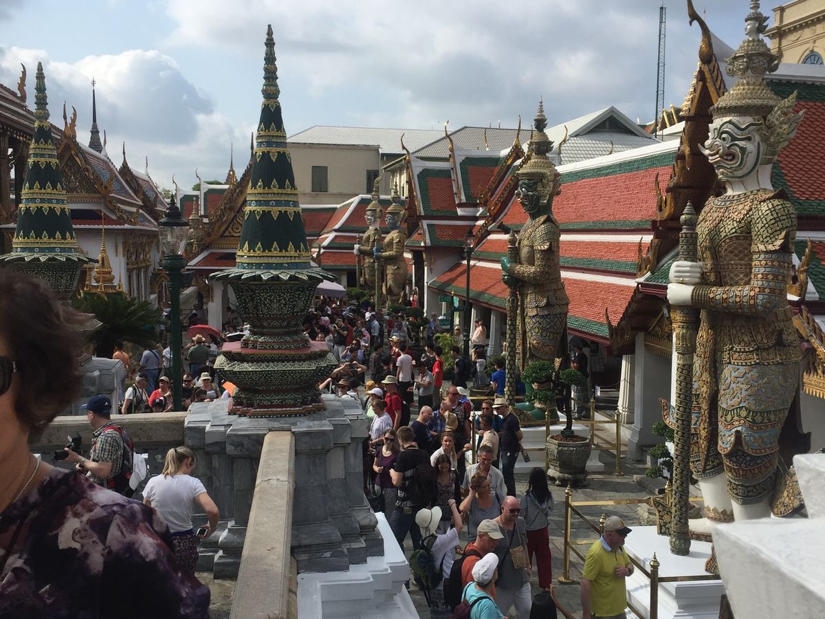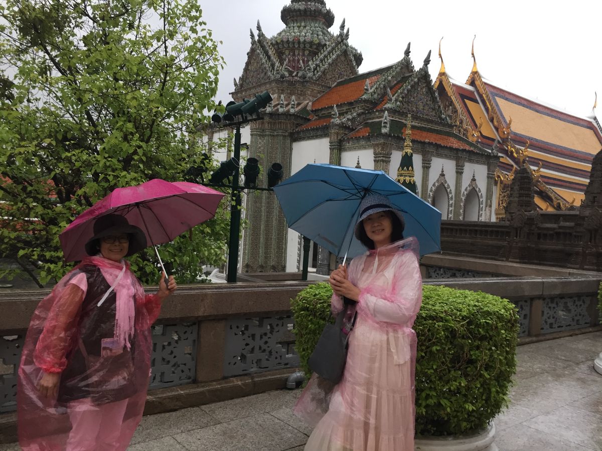 朝から 台風とのこと。日本でいう台風とは少し違う気象でした。ホテルを3つほど回り 集合して出発する頃にはすでに1時間以上経過してました。雨の中 ガイドさんは グループごとに カメラのシャッターを押してくれました。現地の方は雨に濡れることには あまりこだわらないようでどしゃ降りの中見学しました。エメラルド寺院は修復が完全に終了してましたが、残念ながら上まで上がるのは禁止になってました。ワットポーは 見どころの足の裏が修復中で見られませんだした。ですが自分たちでは こんなにスムーズに回れないので いいツアーでした。