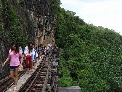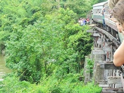 タム・クラセー駅の手前の木造の橋脚では 下が見える線路の上を対向者にドキドキしながら少し渡りました。スリル満点です。