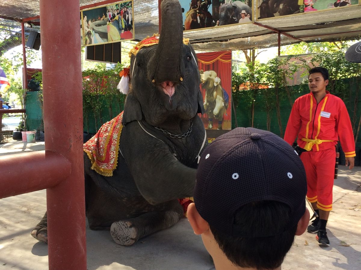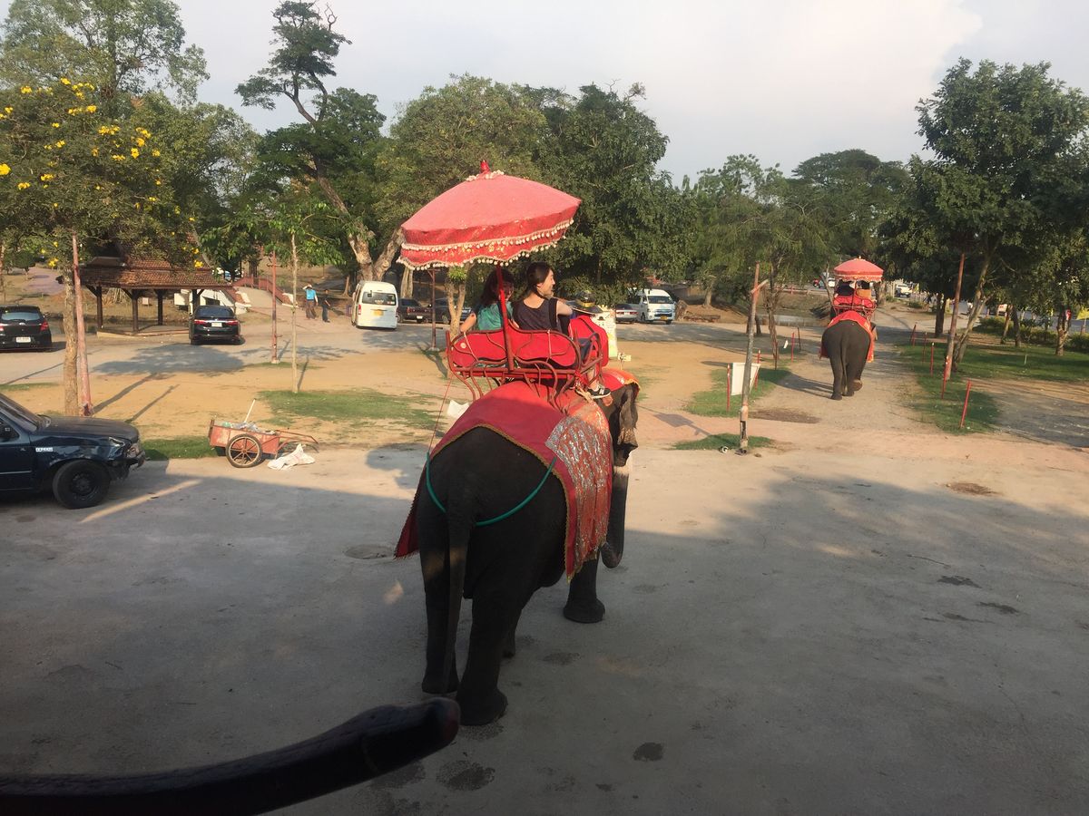 スピードボート、水上市場の手漕ぎボート、アユタヤの象と、様々な乗り物に乗ることができました。象と車が道路で一緒にいるのは興味深いものでした。