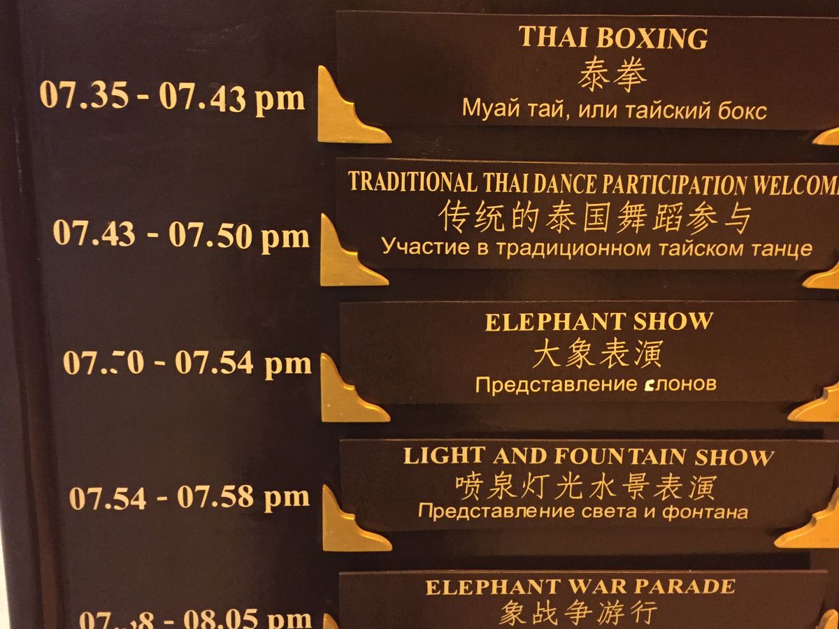 せっかくのビュッフェも大急ぎで適当に切り上げざるを得ず、結局19:35から正面の前庭で行われる5つのショーのうち4つは見れませんでした。さらに入って左手奥にある「タイ文化村」のような施設もほぼ終わっており体験出来ず。はっきり言って返金して欲しいです。