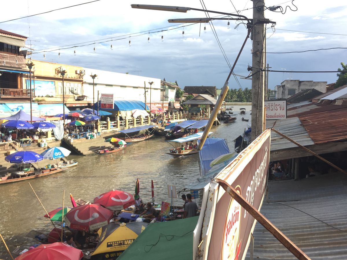 ココナッツシュガーを作っている工程も見ることができました。60バーツでココナッツシュガーGet!次は水上マーケット!モーターボートで向かいました。思っていたよりもスリルがあリ楽しかったです。手漕ぎボートは200バーツで乗れました。交渉次第で安くなります。ちなみに1⁄5まで値下げできました。お昼はバンコクに戻りビュッフェ!タイ料理三昧でした。