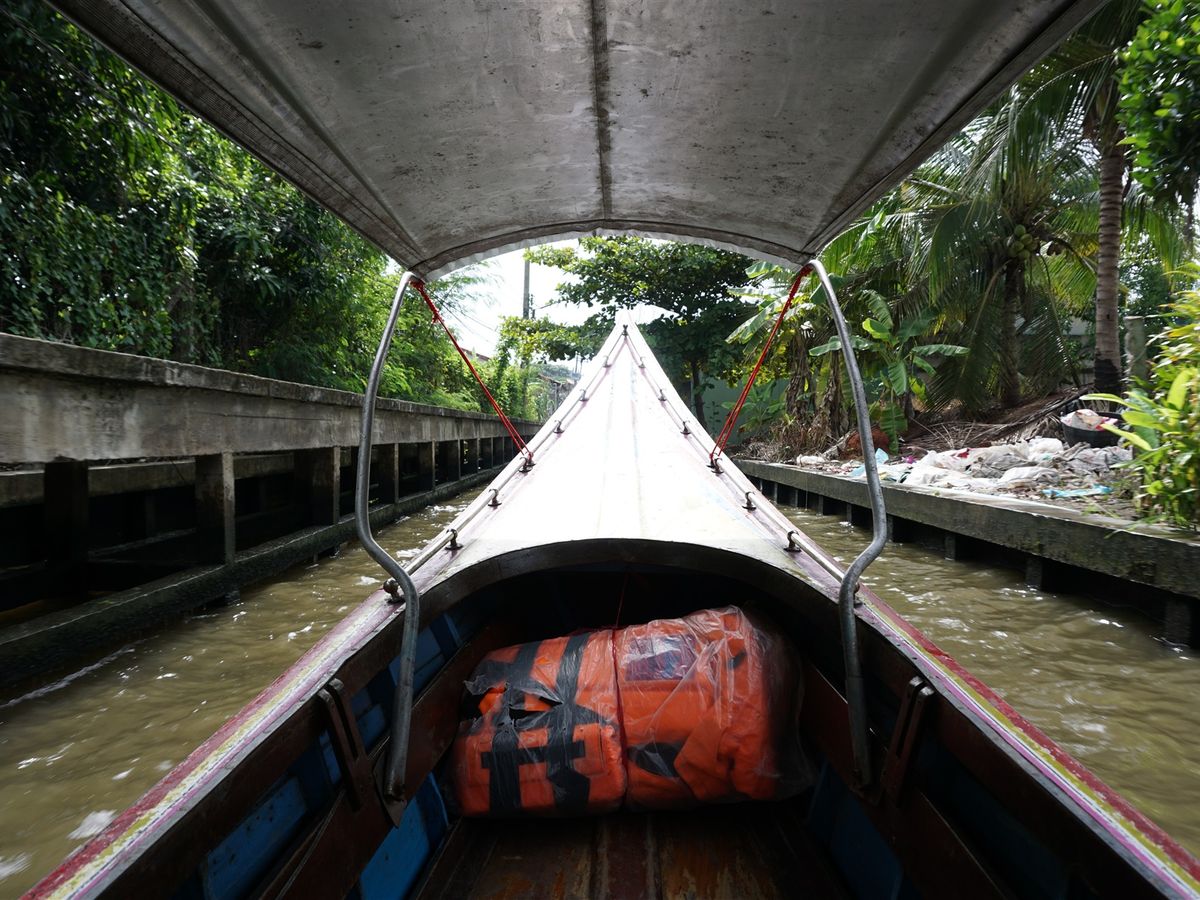 高速で航行するエンジンボートで水上マーケットまで行きます。ガイドさんは車で先回りします。席によっては水しぶきがかかるかも…なお、水は死んでいます。
