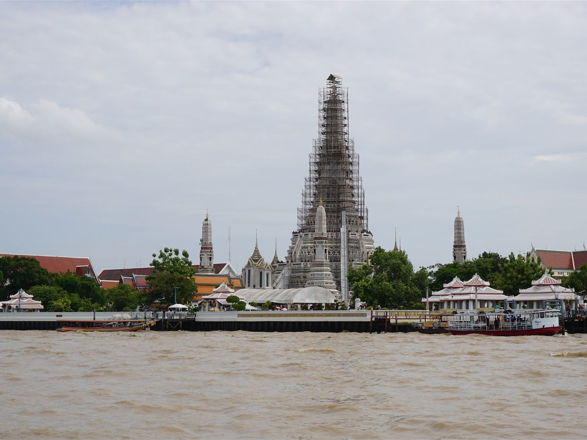 チャオプラヤ川を渡船で渡って行きます。現在修復中なので足場が組まれています。