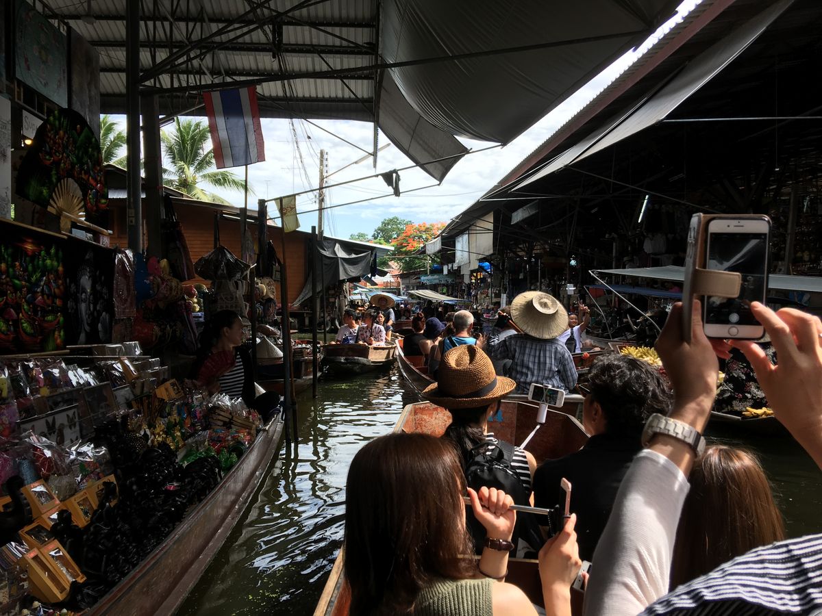 水上マーケットへ。別料金200Bをそれぞれ支払い手漕ぎボートです。水上マーケット混雑してます。舟と船がガンガン当たります。絶対手を出してはいけません!