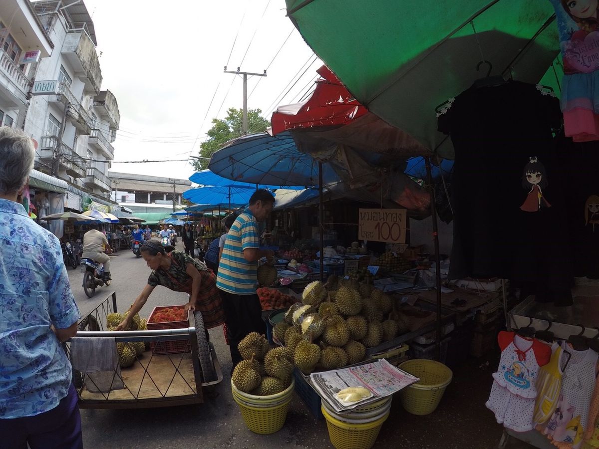 3時間ほどの移動時間を終え、まず行ったのはローカル朝市です。私たちは前日にメークロン市場を訪れていたのですが、同じ市場にといっても全く異なりました。このツアーの市場では主に果物を売っていて、メークロン市場でも見なれなかった珍しいものがたくさんあります。あまり生魚は売っていないので、魚臭くなくてよかったです(笑)
