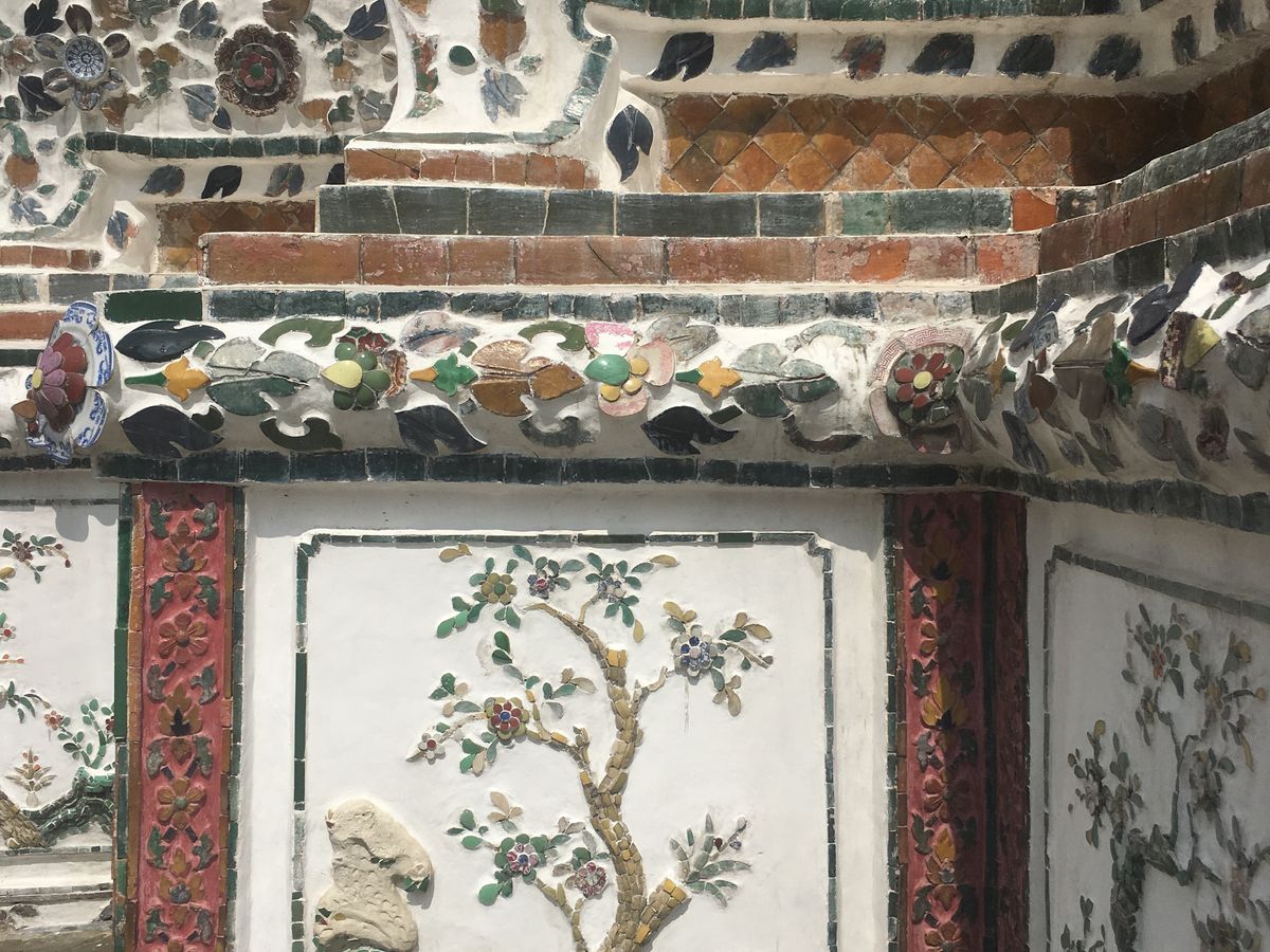 王宮もエメラルド寺院も、これぞ、タイ!って言う感じの建物で、細部まで見とれてしまいます。そこから歩きで船着場に移動、日傘が役立ちました。船に乗り対岸のワットアルン暁の寺院に、回収工事中でしたが、色鮮やかな陶器片のモザイク模様が素敵でした。自由時間もありゆっくり写真撮ったりできました。また、船に乗り、ワットポーに、ここも、すごい混雑。集合場所を確認して自由行動。