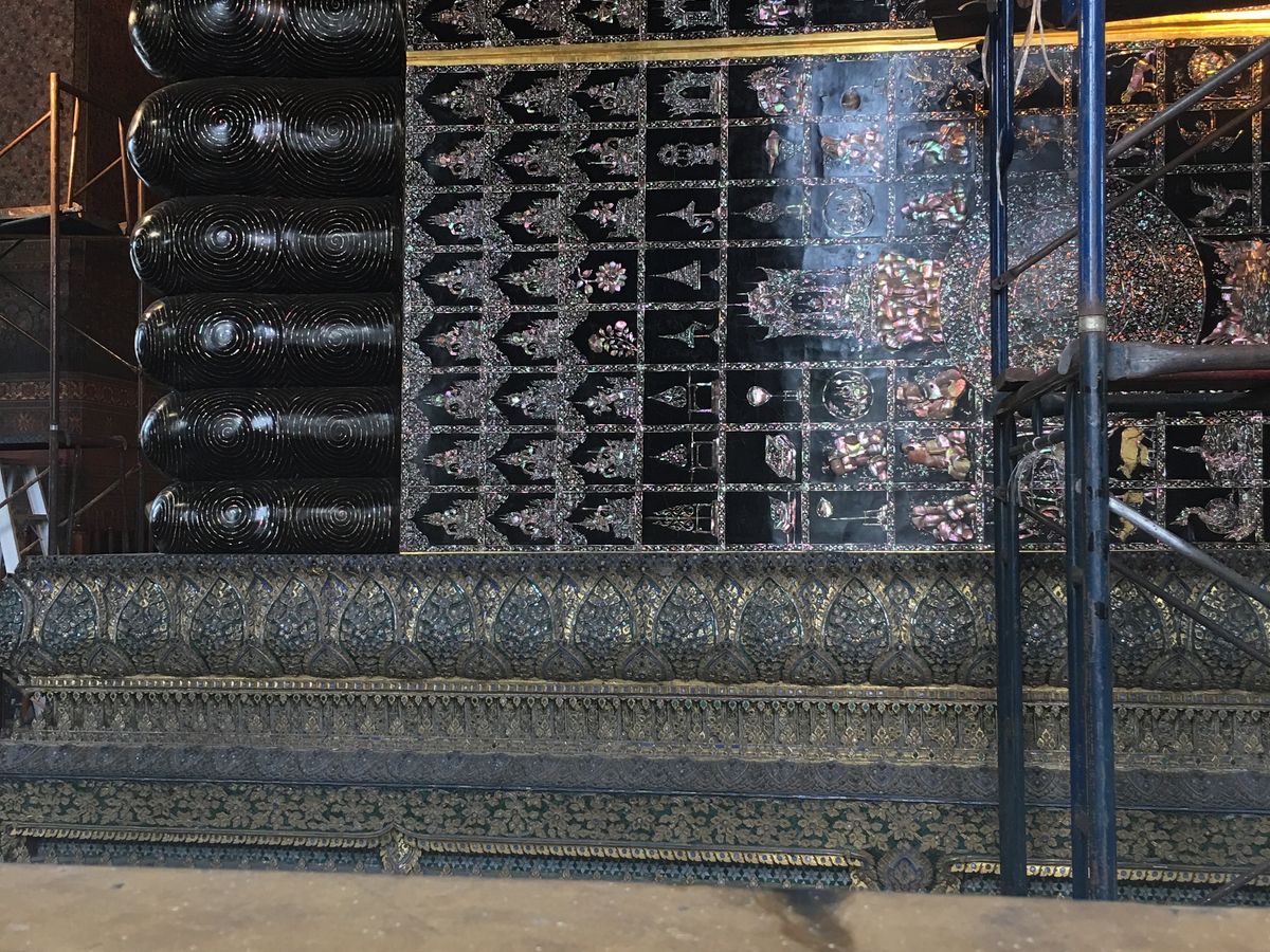 寝釈迦仏の周りは人混みで、ガイドさんが、常に荷物を確認して、スリに合わないように!と言っていたのがよくわかりました。寝釈迦仏の反対側の壁の壁画も素敵です。