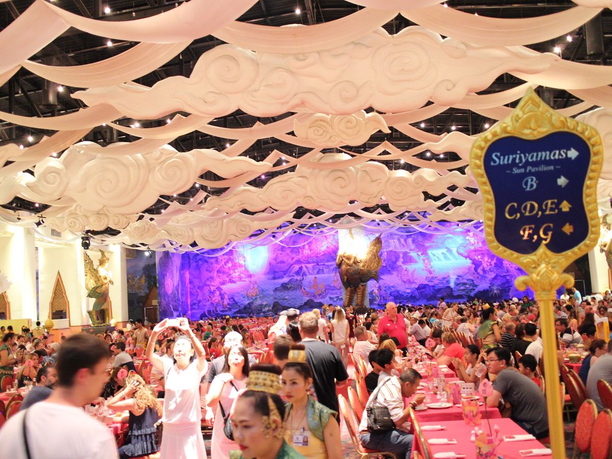 期待していませんでしたが、炒め物、煮込み系、ご飯系など全て美味しかったです。飲み物はテーブル注文毎にお支払いします。とにかく広いレストランですがスタッフは多く不自由しませんでした。先に食事を済ませて園内を散策しましたが、園内には休憩スペースがあまりなく、雨が降ったこともあり、涼しい中でビールを飲んで開演を待ちました。