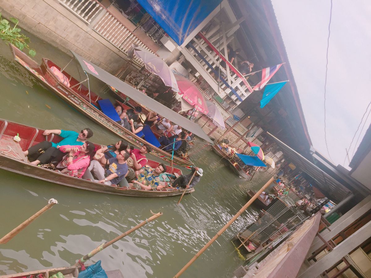 次の水上マーケットでは全員が手漕ぎボートの予定でしたが、参加した4月15日はソンクランの期間中であり、沢山の観光客が集まっているからか、船が大渋滞で乗れる船が来ませんでした。